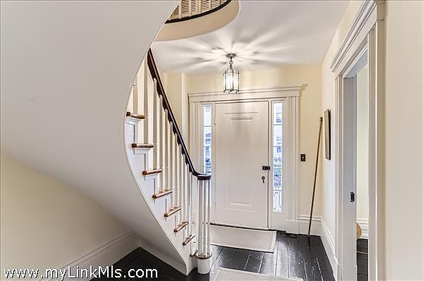 Two of the five bedrooms are on the first floor, including a private ensuite with a full bath. The home is notable for its unusually large and abundant windows, flooding the south-facing interior with natural light. The winding staircase is a sculptural centerpiece that greets you as you enter through the original front door. Renovations include a new roof over the porch, three modernized bathrooms, and updates throughout the first and second floors, all carefully designed to honor the home’s historic charm.