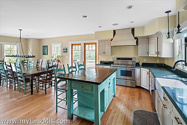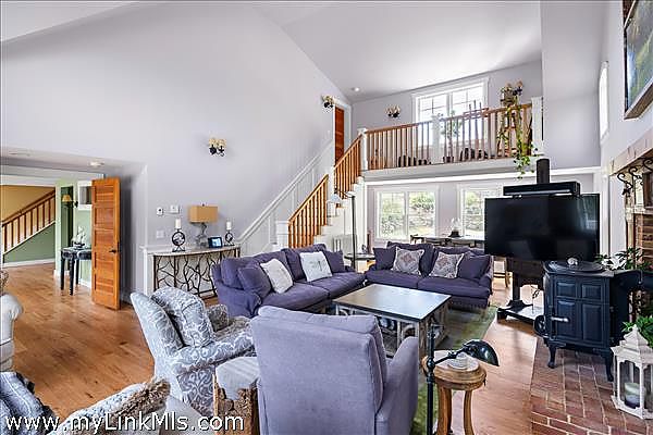 Picturesquely sited on a spacious 4.6-acre parcel, this remarkable property is the perfect Vineyard retreat offering a luxurious home, guest house, and a fabulous barn. The location is ideal just minutes from Lamberts Cove Beach, hiking trails, Up-Island Cronig’s, and all the conveniences of West Tisbury Center. Each area is designed with three distinctive living levels and provides spacious yet private surroundings. The main living area features a great room with dramatic ceiling height. The kitchen and spacious dining room enjoy direct access to the deck. An ensuite bedroom, half bath, and laundry/mudroom complete this floor. The primary suite occupies one side of the second floor with a walk-in closet and full bath, and a three-bedroom guest wing with a private den and full bath offers plenty of privacy. You will be pleasantly surprised with the finished lower level, designed by architect, Chuck Sullivan, for fun and recreation. The spacious game room is perfect for entertaining, watching sports on TV, playing billiards or ping pong, or simply relaxing at the delightfully designed bar with oak barrel barstools. Two additional bedrooms on the lower level provide a more private space for guests and visitors with two exquisitely appointed bathrooms. The library is truly one-of-a-kind with built-in floor-to-ceiling bookshelves and boasts an 81” TV that can be hidden away behind custom cabinets when entertainment calls for a more formal ambiance. A Sonos Sound System was installed throughout the house, ensuring you can always listen to your favorite tunes. There is so much to enjoy here, indoors and out, and creating this stunning Vineyard Farmhouse Estate has truly been a passion of love. The two-story guest house with a new deck overlooks the Egyptian Lotus Pond and awaits your vision. Completing this offering is a large two-story post and beam barn built in 2014.