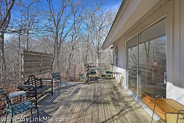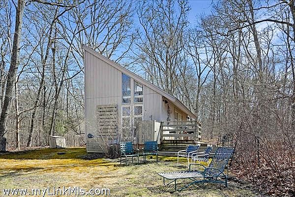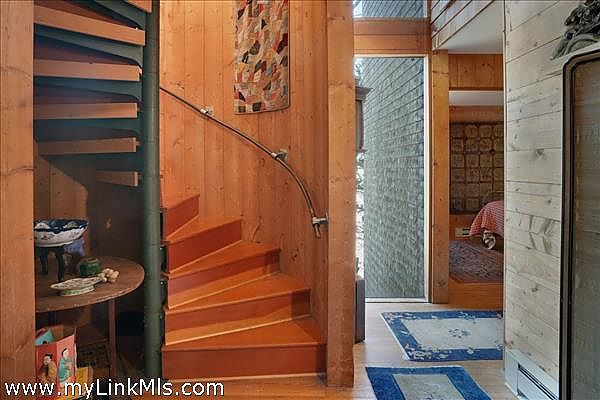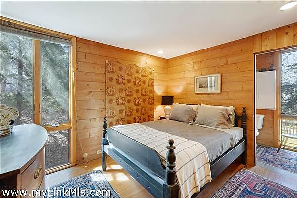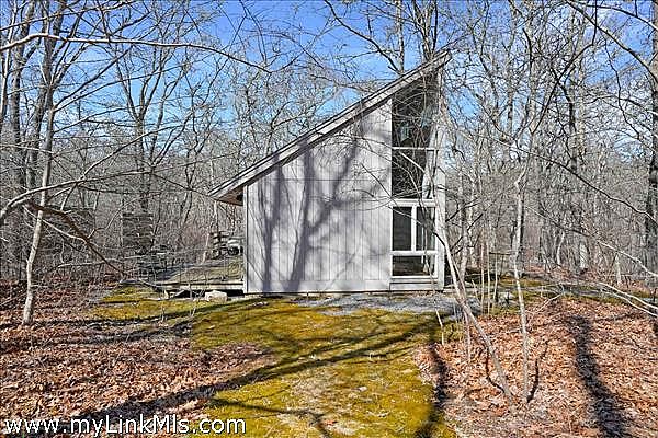 Perched atop Fulling Mill Hill this distinctive contemporary main house plus guest house offers mid-century charm and a serene retreat set on 3.3 acres of mature oak and beech forest and bordered by an ancient stone wall. Designed by renowned Yale School of Architecture Dean Paul Mitarachi, the main house features a striking circular entryway framed by mature Asiatic gardens. Step inside to discover a custom circular staircase with dramatic floor to ceiling windows, leading to the upper living area flooded with natural light from the wall of south-facing windows. The living area with high ceilings and woodstove is a comfortable place to congregate, while the kitchen and open dining areas lend themselves to modern day living. Glass sliding doors open onto a spacious 2nd story deck giving the entire living space an intimate relationship with the outdoors. On the first floor there are three total bedrooms; two bedrooms sharing a full bath plus a primary bedroom with a full bath en-suite.