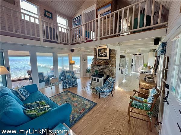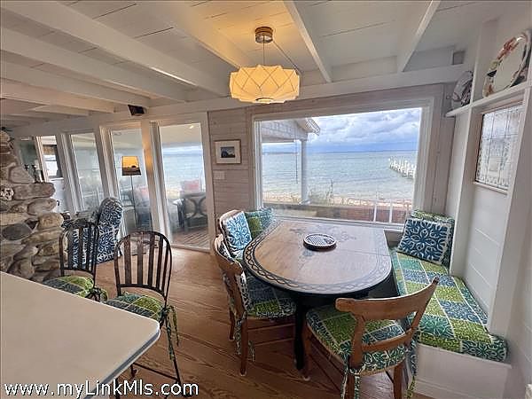 This classic East Chop Drive gem lies on a 10,000 sq. ft. lot nestled in the sand dunes, just steps to the waters edge and private dock. The 4-bedroom/2.5-bath cottage went through a substantial renovation years ago with the majority of mechanicals, electrical and plumbing being updated. There is an open floor plan with kitchen, dining and living space with cathedral ceiling and wood burning fireplace. There is a ground floor master with private bath and lots of glass, a second bedroom with half bath and laundry/mudroom. The second-floor features 2-bedrooms and a shared bath. The cottage style structure is super charming inside and out and has a wonderful water facing brick terrace with built-in planter, a covered porch and a one-car garage. Beautiful landscaping with lawns and gardens complete this very special property. Let's not forget to mention, it offers some of the best seats on the Island to take in the incredible sunsets.