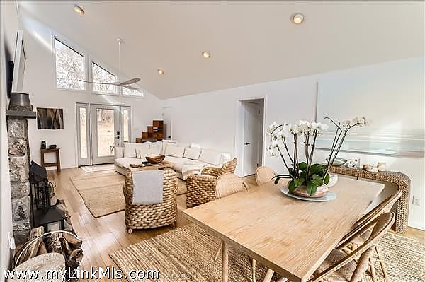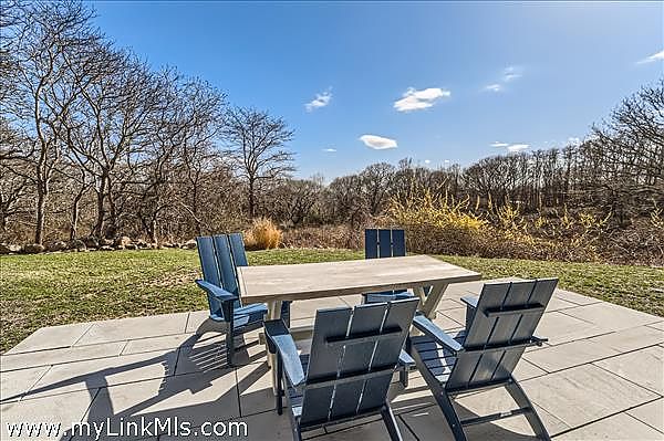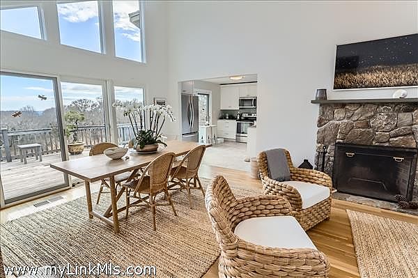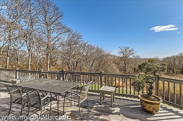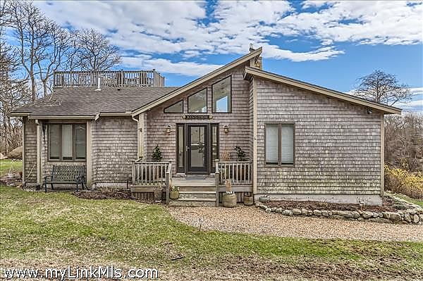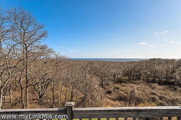 This beautifully renovated contemporary home is perched on a hillside, offering views of the Atlantic Ocean. The property features updated furnishings and a breezy atmosphere, your perfect island getaway. Enjoy multiple outdoor areas including a large deck with dining for eight, as well as a rooftop deck, or "crow's nest," where you can take in the 180-degree views of the Atlantic and enjoy sunset evenings. The main level consists of an open-concept kitchen, living, and dining area with soaring ceilings and sliding glass doors that overlook the treetops of Aquinnah and the ocean beyond. Two bedrooms share a full bath, and the primary ensuite bedroom completes this level. Descend to the newly finished lower level, which features a lovely media room, an office, and additional sleeping space. You can walk out of the lower level sliding doors to a beautiful and private patio, providing three levels of outdoor enjoyment. Central air conditioning throughout and conveniently located less than a mile from Philbin Beach, stroll, bike or dive to the town parking lot just a few minutes away.