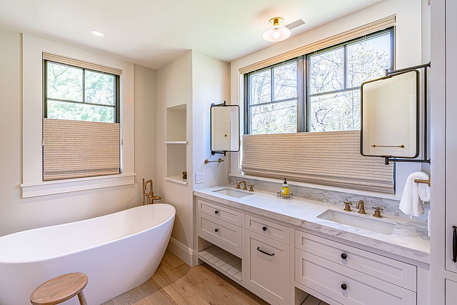 The first of two primary suites graces the main level, offering beautiful water views. This retreat hosts a King Bed and a spa-inspired bath with dual vanities, a soaking tub, and a walk-in glass shower.