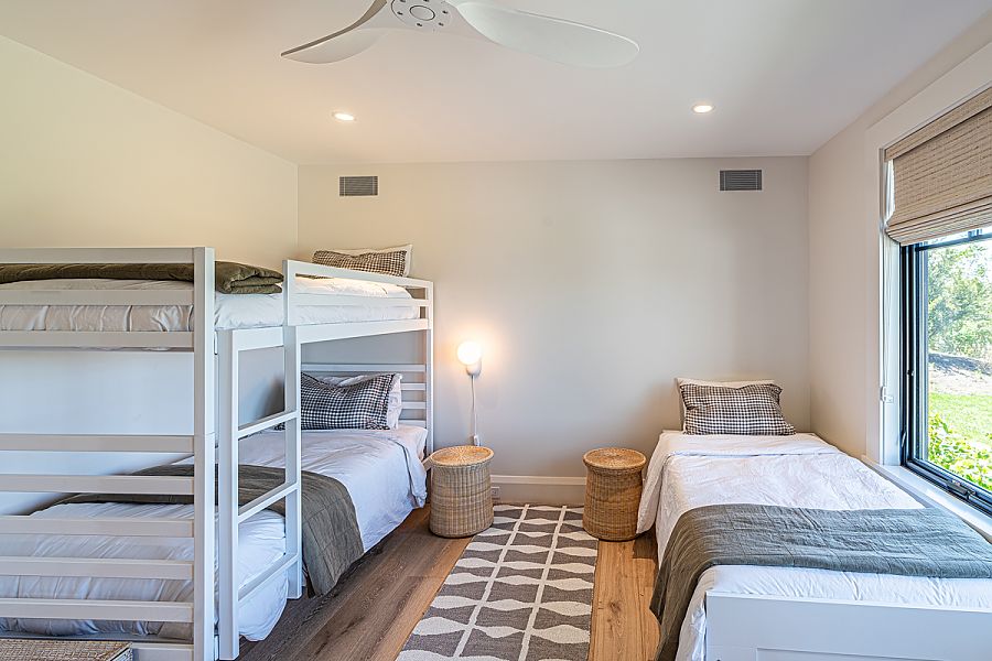As you descend to the lower level, you're welcomed by a contemporary family room boasting a sleek media center and expansive glass sliders that open onto one of two inviting bluestone patio areas. At one end of this level, you'll find the second spacious Primary Bedroom featuring a luxurious King Bed and an en-suite bath. Bedroom 3, perfect for children and teens, offers a bunk bed and a trundle bed, with convenient access to a generously sized bath directly across the hall.