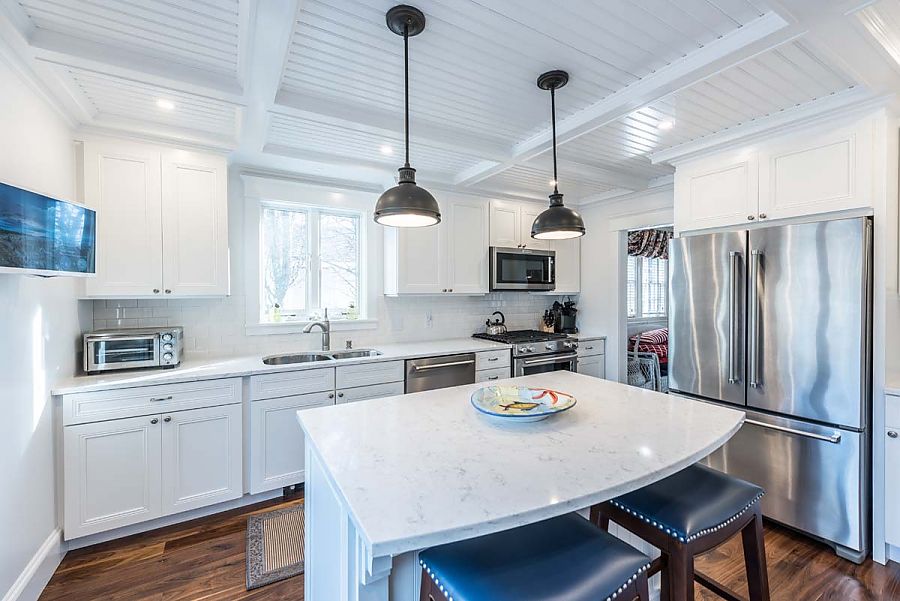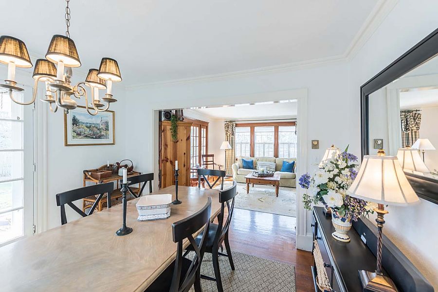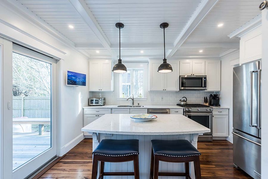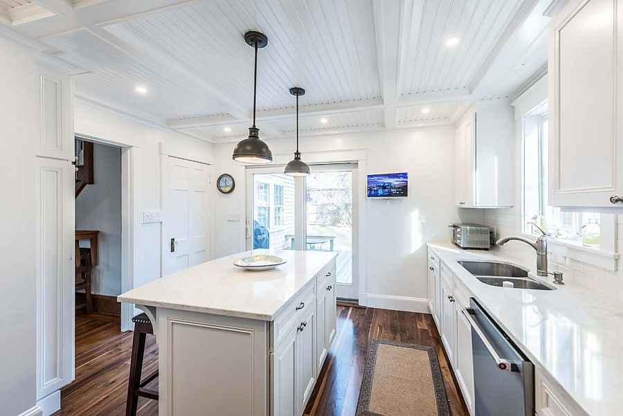 The main level of the house features a new chef's kitchen with prep island, breakfast bar, and custom cabinets. The kitchen opens on one side to the main living area with comfortable sofa seating and TV and opens on the other side to the dining area.  There is a powder room just off of the hall entry. The kitchen area opens to the back deck providing a nice flow for outdoor enjoyment.  The dining and living areas open via french doors to the front porch area.