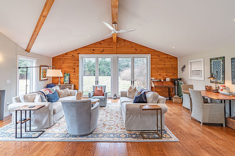 Bedroom 3: 1st Level, King, AC central, ceiling fan, shares hall bath with bedroom 2Guest House, 50 yards from Main House, Bedroom 4: 1st Level, King, window AC bath (shower only), Mini kitchen and dining table, large open living area