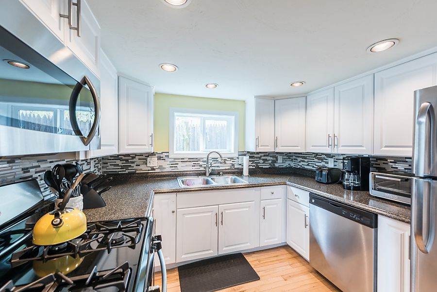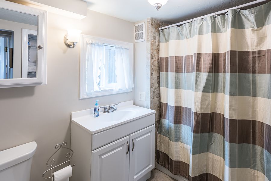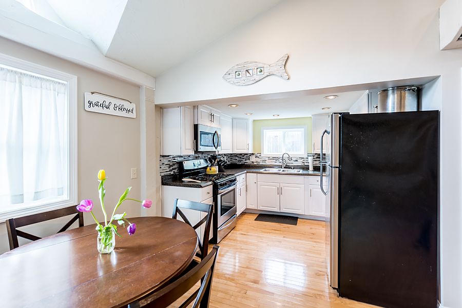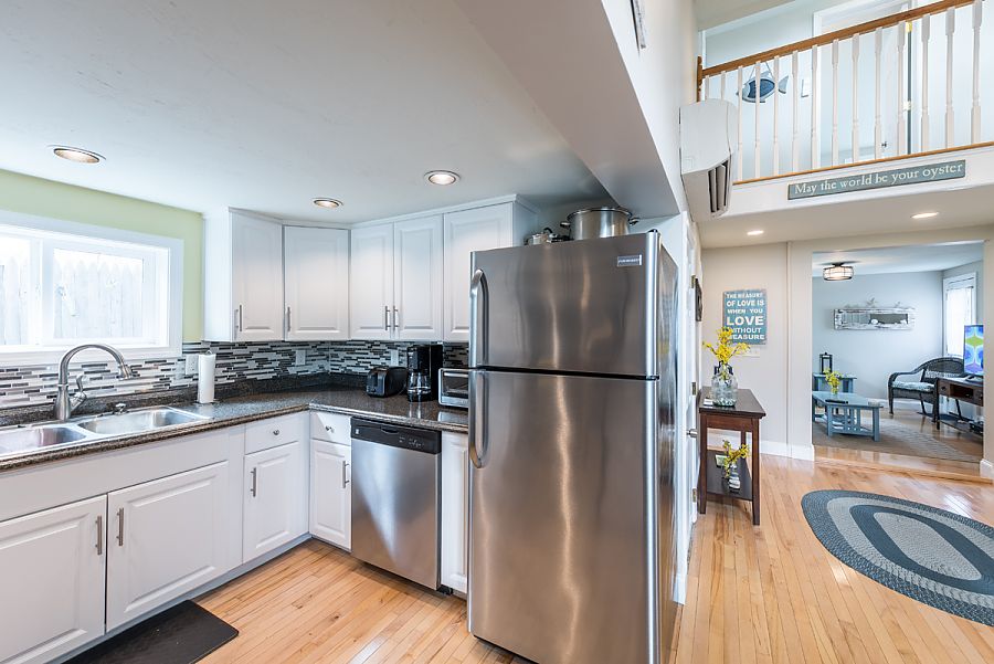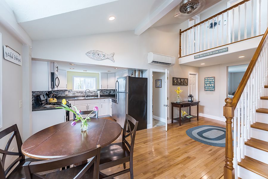 Upon entering you are greeted with an open floor plan in the living, kitchen, and dining areas. The living room is tastefully and comfortably furnished and has a 50" flat-screen TV.  The recently renovated kitchen features stainless appliances, stone counters, a gas range, and recessed lighting. The first level is completed by a full bath.