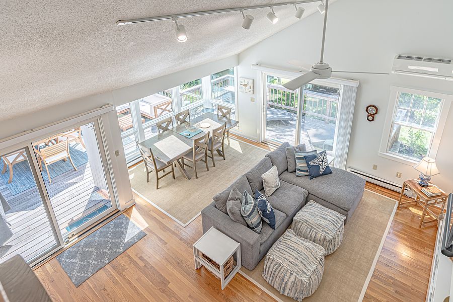 All are sure to enjoy this beautiful 4 bedroom, 2 bath contemporary home that is newly painted, furnished, and sleeps 8. Multiple living spaces include the main living area with a TV that opens on two sides to a wrap-around deck with an outdoor living area and patio dining.  Additional living space is available in the lower-level family room comfortably furnished around the media center.
