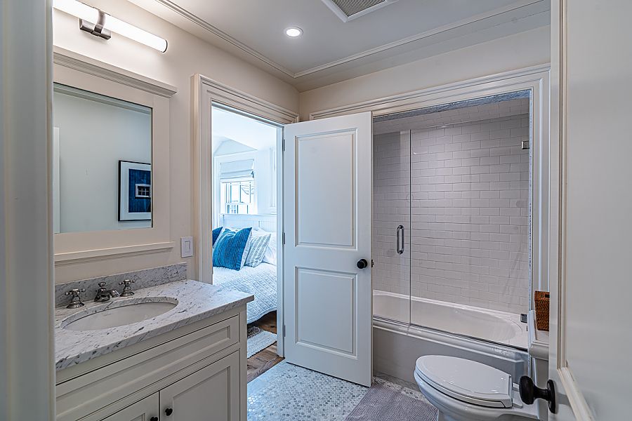 The home features five bedrooms, including two luxurious primary suites. The first primary suite is located above the carriage house, accessible from within, and includes a king bed, a private bath, and a TV. The second primary suite, located on the second level of the main house, also features a king bed, a TV, an en suite bath, and opens to a lovely roof deck with seating.