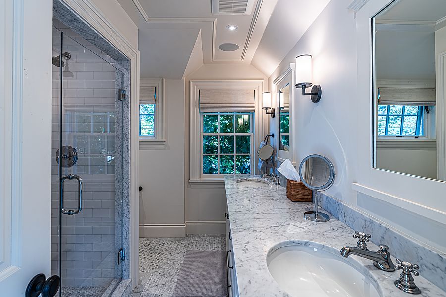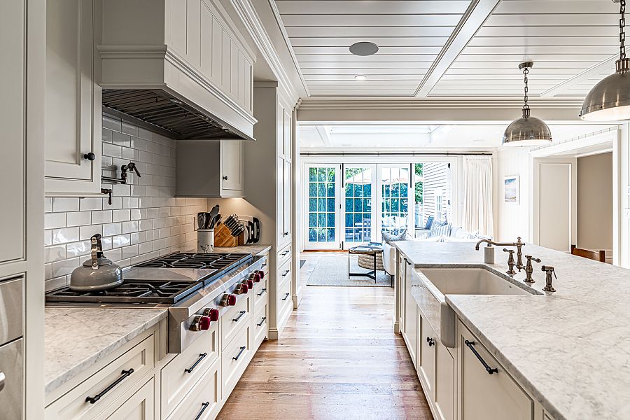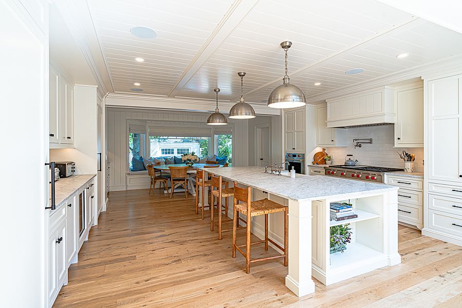 The gourmet kitchen is a culinary delight,  complete with a large prep island and breakfast bar, stunning marble countertops, top-of-the-line appliances, a farmhouse sink, and a wet bar/coffee station. A charming breakfast nook, set in a bay window, comfortably seats eight.