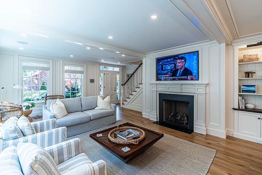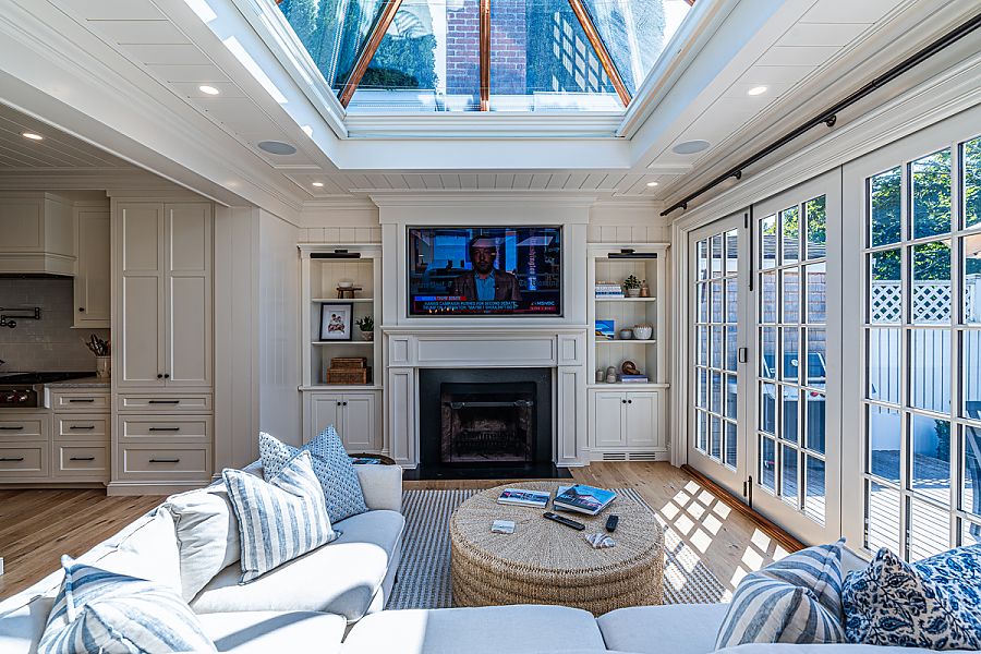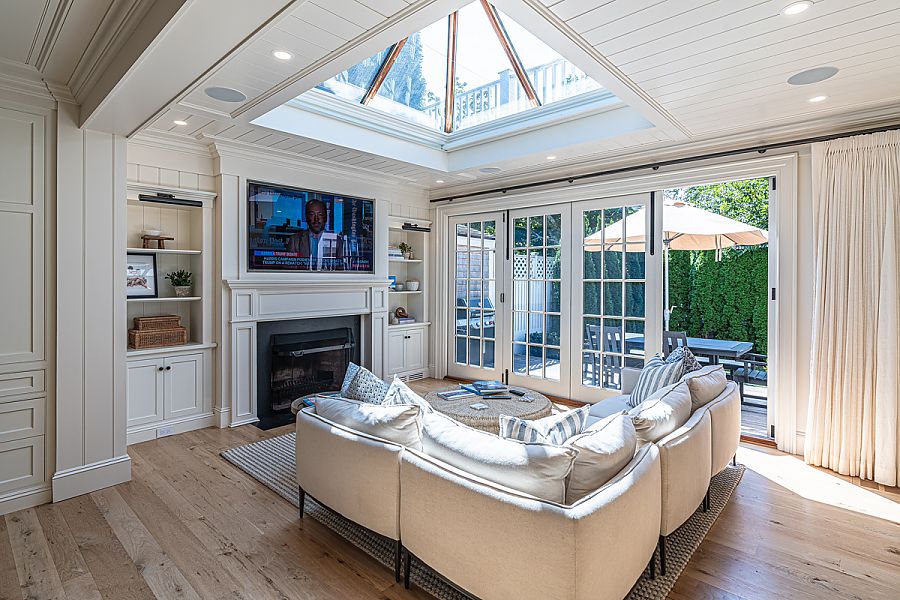 The main living level features an expansive open-concept living and dining area, showcasing hardwood floors and custom-built bookcases that elegantly frame one wall. Cozy seating surrounds the media area, creating a warm gathering spot. A small hallway leads to a chef’s kitchen, which includes a lounge area highlighted by a pyramid-shaped skylight, a TV, and seamless access to deck dining through a nanowall that overlooks a quaint private courtyard.