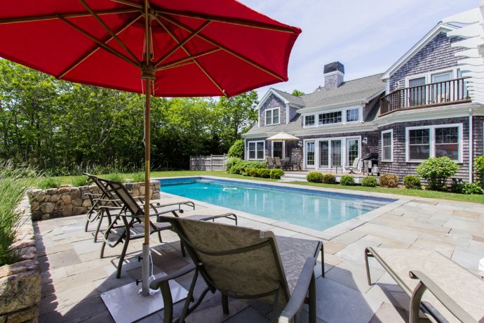 Exceptional Main & Guest House, 20 x 40 Heated Pool with Stone Patio Surround, Tucked on Large Landscaped Acreage, 2 miles to Beautiful Lambert's Cove Beach, Sleeps 8